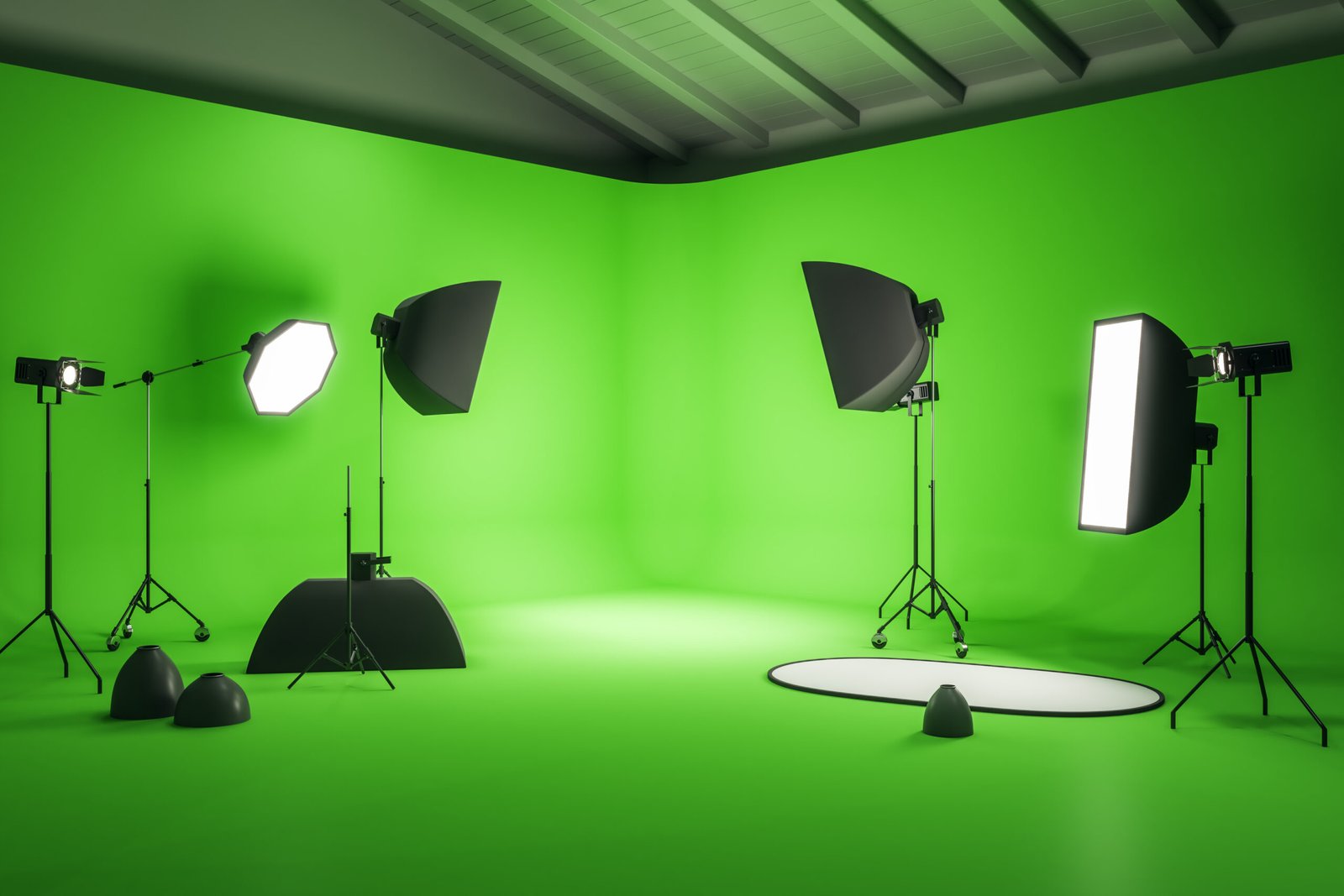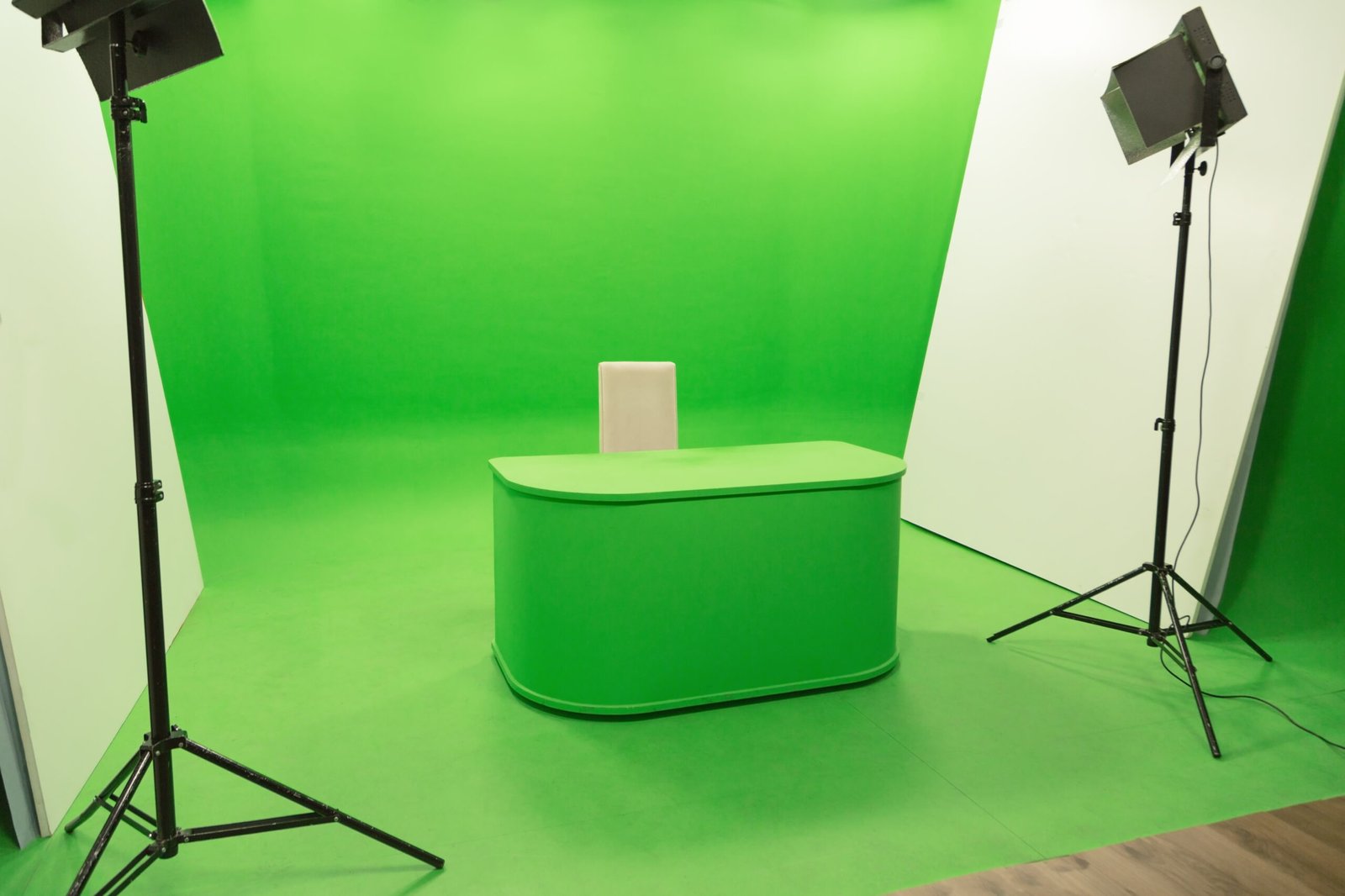 Fully equipped in-house studio with green screen, microphones, and premium lighting